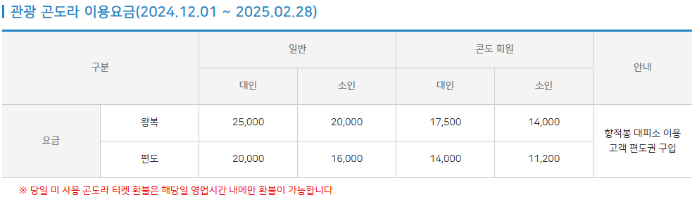 📌 2. 곤도라 운행 시간 및 요금