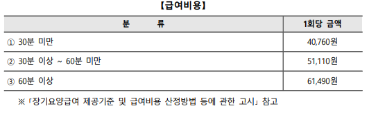 - 요양보호사가 60분 이상 서비스를 제공한 경우를 1회로 산정하되, 소요시간이 40분 이상 60분 미만인 경우에는 1회당 금액의 80%를 산정함